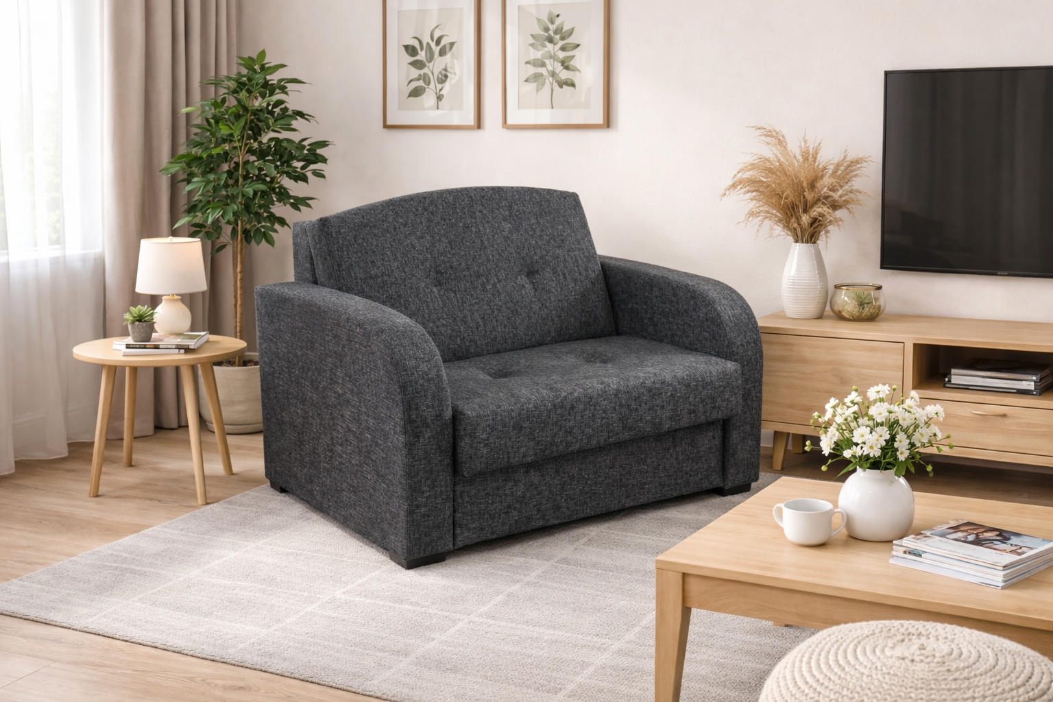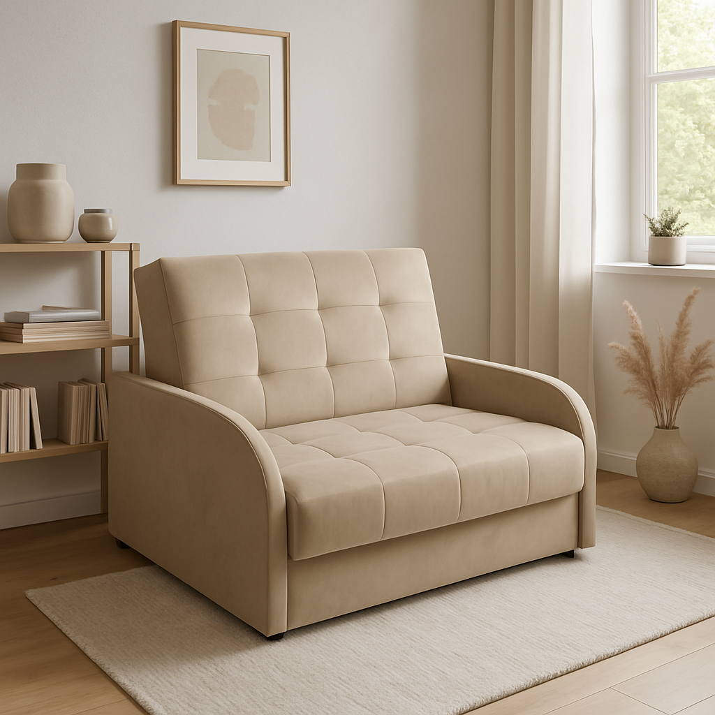 Fotel rozkładany DORIS to kompaktowe rozwiązanie typu „amerykanka”, idealne do małych wnętrz. Dzięki funkcji spania szybko zamienia się w wygodne miejsce do wypoczynku, a wbudowany pojemnik na pościel zapewnia dodatkową przestrzeń do przechowywania. DORIS łączy w sobie komfort, funkcjonalność i elegancki wygląd – doskonały wybór do salonu, pokoju młodzieżowego lub gościnnego.