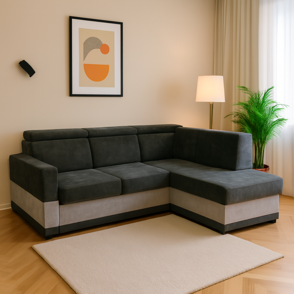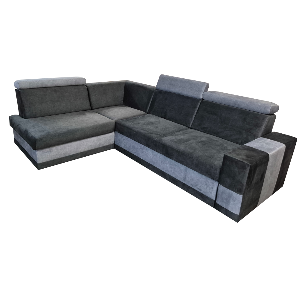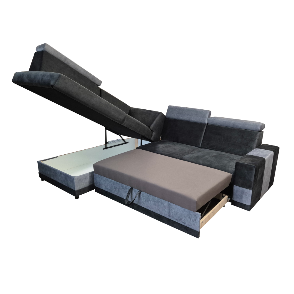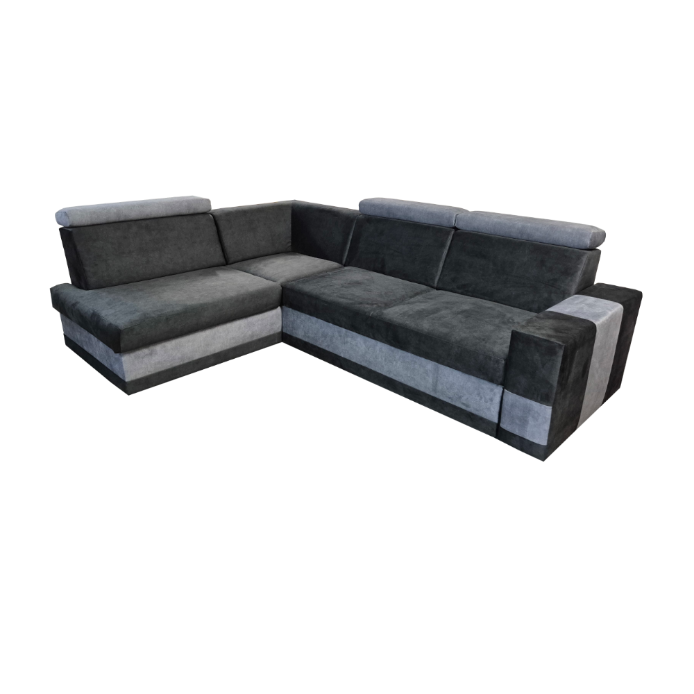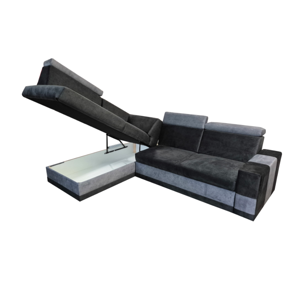 Ten narożnik to połączenie stylu i funkcjonalności. Wyposażony w pojemny schowek na pościel, idealnie sprawdzi się w codziennym użytkowaniu. Regulowane zagłówki zapewniają komfortowy wypoczynek, pozwalając dopasować oparcie